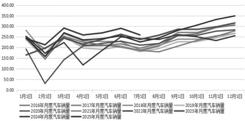 图为2016—2025年国内新车月度销量走势图(单位:万辆)