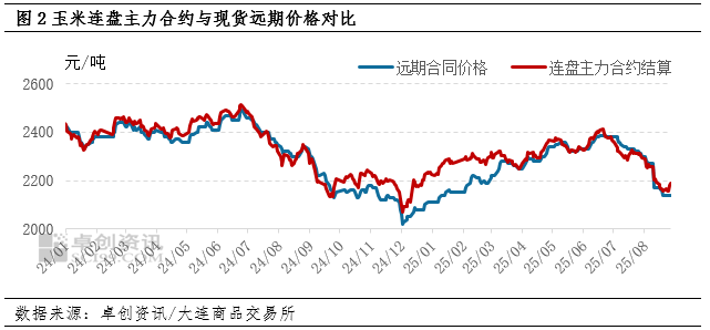 8月影响南北港口价格回落的主要因素依旧为市场看空情绪,一方面东北产区轮换粮拍卖与双向货源的出库持续补充产区供应,而需求端却未持续有对应的采购增量,东北深加工企业普遍下调收购价格表明其采购意向,饲料企业常规库存也基本覆盖至9月末至10月初,供需关系在8月呈现阶段性矛盾提升,利空市场情绪。另一方面新疆玉米零星上市,市场新作开秤价格低于陈作接近150元/吨,给与其他产区一定的预售价格参考与情绪压力,北港新作玉米预售平仓价在2220-2240元/吨,低于目前北港平仓价120-140元/吨。另外期货盘面的走势也给与南北港价格一定程度的趋势参考,从图2中可以看出,8月连盘玉米主力合约结算价格总体呈现下行趋势,截至8月29日连盘主力合约结算价为2187元/吨,较8月1日对应合约的结算价下跌109元/吨,部分贸易商根据期货盘面的价格已经针对新作玉米进行预售,低位的预售价格同样给8月现货价格形成压力。
