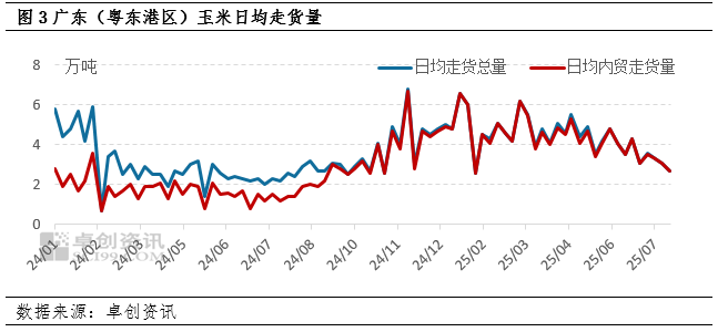 2025年8月东南沿海玉米市场价格总体呈现下行趋势,但月中与月末出现两次价格反弹。以蛇口港代表,截至8月29日港内二等玉米自提参考在2350元/吨左右,较月初下跌50元/吨左右。最低值出现在8月26日前后,蛇口港二等玉米自提参考价在2320元/吨左右,另外在本月14日前后价格出现10-15元/吨的价格反弹,持续时间在5天左右。