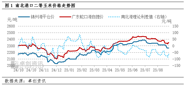 8月月末的南港价格回升则主要为贸易端对9月需求缺口的预期提升,并且同样受到期货盘面的侧面支撑。8月东北产区持续降雨,虽然对新作产情有利,但同样会延长作物的生长周期,根据卓创资讯的调研,往年辽西地区9月上旬上市的早熟品种预计将推迟10-15天上市,辽东、辽北以及吉林部分地区的玉米也有可能出现不同程度的延后上市情况。这就使得销区增加了10-15天左右的需求增量空间,而南港目前玉米的主要来源为北港,进口到货依旧较少,增加的需求空间对现有的供需关系预期存在利多影响,并且月末期货盘面也出现反弹迹象,使得南港玉米市场价格在本月二次出现反弹。