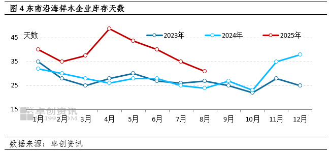 8月南港价格出现两次回升,其中月中小幅回升主要是因阶段性需求提升导致,月末的回升则更多为需求预期提升叠加市场情绪好转。8月上旬由于7月利空情绪延续与频繁降雨因素的影响,港口走货量持续下降,下游企业库存也随时间持续降低,8月中旬随北港成本松动,下游中大型企业补库签单积极性提升,也带动中小企业采购补库量增加,从图3中可以看出,7月至8月上旬港口走货量持续下降,而8月中旬后走货量明显提升。阶段性需求的提高对南港价格形成了利多影响,使得价格出现反弹,但随着下游中大型企业订单采购结束,市场需求减弱,南港到货增加,供应压力再度提升,市场价格再度因贸易竞争压力持续下探。