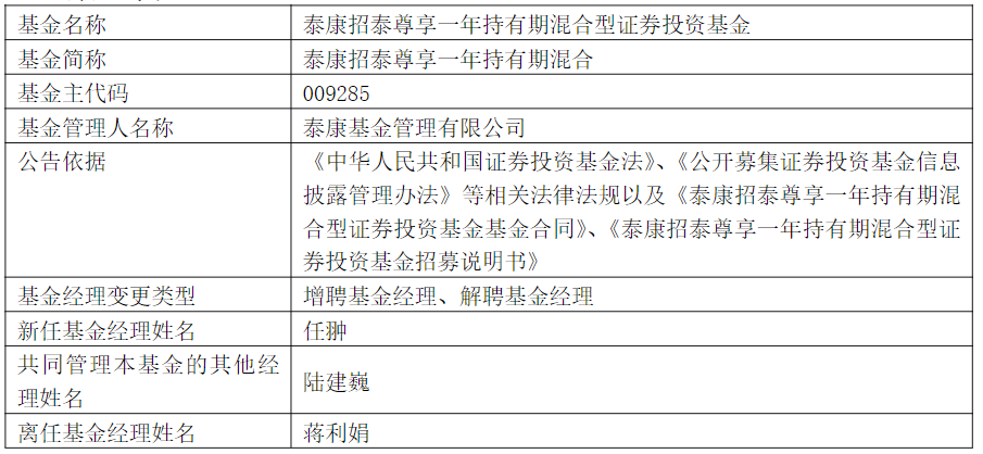 泰康招泰尊享一年持有期混合增聘任翀蒋利娟离任