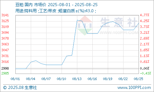 据生意社商品行情分析系统显示,8月豆粕行情涨势不断,整体振荡走高。8月1日,豆粕市场均价2998元/吨,8月25日,豆粕市场均价3120元/吨,上涨4.07%。