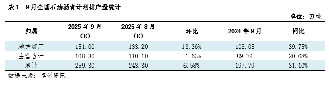 据卓创资讯数据统计,9月全国沥青计划排产259.30万吨,较8月计划排产增加16万吨,增幅6.58%。虽然主营炼厂沥青排产小幅下滑,但在原油配额生产沥青持续盈利的情况下,地方炼厂计划排产延续增加趋势,9月增量主要来自河北鑫海、岚桥石化和弘润石化。从时间进度来看,9月份259.30万吨的计划排产大概率将成为年内产量最高水平,沥青供应端继续施压现货市场。