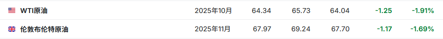 3. 截至发稿,WTI原油跌1.91%,报64.34美元/桶。布伦特原油跌1.69%,报67.97美元/桶。