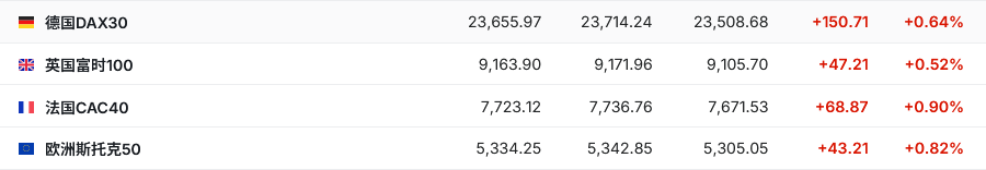 2. 截至发稿,德国DAX指数涨0.64%,英国富时100指数涨0.52%,法国CAC40指数涨0.90%,欧洲斯托克50指数涨0.82%。