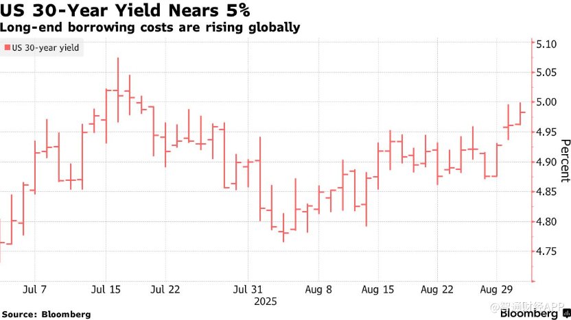 随着全球政府债券抛售加剧,美国30年期国债收益率自7月以来首次逼近5%。债市的动荡也波及美国股市。