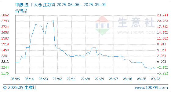 9月4日,生意社甲醇基准价为2243.33元/吨,与本月初(2233.33元/吨)相比,上涨了0.45%。