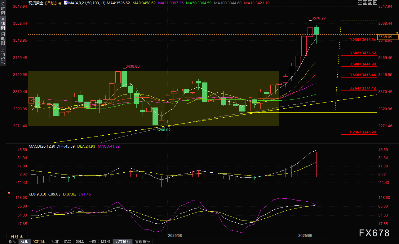 汇通财经APP讯——周四(9月4日)亚欧时段,现货黄金正延续前一交易日从历史高点3578-3579美元区域开始的回调走势,一度下跌1.33%(近50美元)至3511.44美元/盎司,目前小幅回升至3540关口附近。全球债券市场趋于平静,缓解了投资者的焦虑情绪,股市表现稳定即是明证,这种环境下避险贵金属在超买条件下引发部分获利了结。此外,美元买盘的出现成为削弱黄金需求的另一因素,加剧了当前的技术修正。不过,仍有逢低买盘给金价提供支撑。