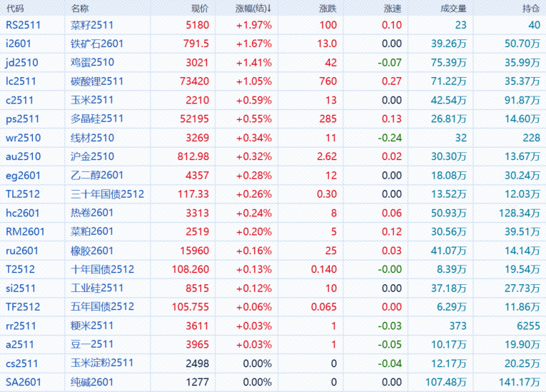 9月4日,午盘收盘,国内期货主力合约跌多涨少。铁矿石、鸡蛋、碳酸锂涨超1%;跌幅方面,红枣、低硫燃料油(LU)跌超3%,燃料油、SC原油、沥青、PTA跌超2%,烧碱、焦煤、瓶片跌超1%。