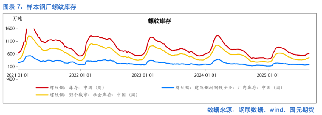 7月,螺纹钢样本钢厂开工率为43.87%,月环比增加0.59个百分点;螺纹钢周均产量为217.58万吨,月环比增加2.89万吨,变化幅度为1.35%。螺纹钢周均表观消费为200.63万吨,月环比下降17万吨,幅度为-7.82%。螺纹钢库存为623.39万吨,月环比增加77万吨,幅度为14.10%;其中,厂内库存为169.62万吨,月环比增加4.32%。社会库存为453.77万吨,月环比增加18.22%。