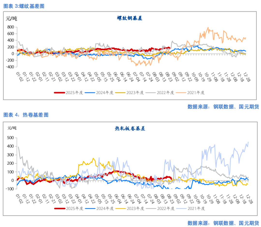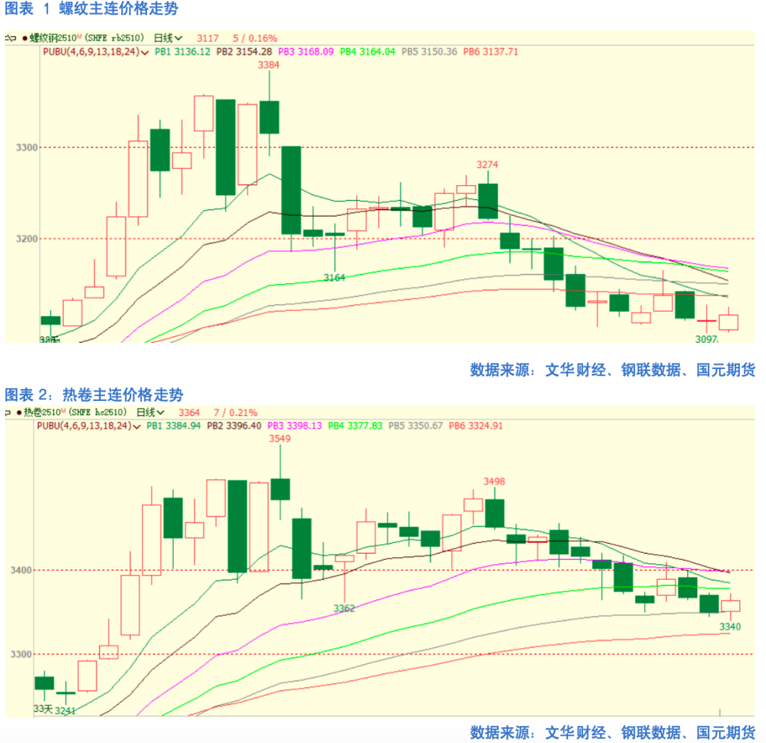 八月螺纹钢及热轧卷板主力合约先扬后抑,偏弱震荡。螺纹钢2510合约跌约2.93%,热轧卷板2510合约跌约1.21%,卷螺差震荡中上旬走扩,下旬走缩。钢厂利润在下旬收缩,成本支撑钢价底部。