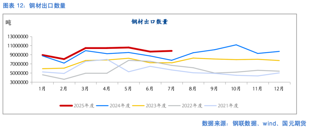钢材直接出口及间接出口维持高位,存在“抢出口”因素 :2025年7月中国出口钢材983.6万吨,较上月增加15.8万吨,环比增长1.6%;1-7月累计出口钢材6798.3万吨,同比增长11.4%。7月中国出口家用电器37610.0万台;1-7月累计出口258961.7万台,同比增长2.2%。7月,销售各类挖掘机17138台,同比增长25.2%。其中,国内销量7306台,同比增长17.2%;出口量9832台,同比增长31.9%。2025年7月中国出口汽车69.4万辆;1-7月累计出口416.6万辆,同比增长19.7%。