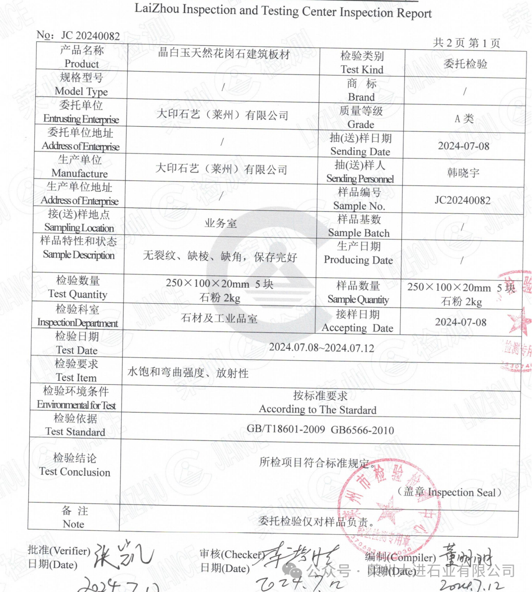莱州晶白玉吸水率0.36%,体积密度2.60g/cm3,压缩强度143MPa,弯曲强度通常13.9MPa,应用于中央党校大庆基地、奥运会青岛奥帆中心、柬埔寨机场等国家和省市重点工程。