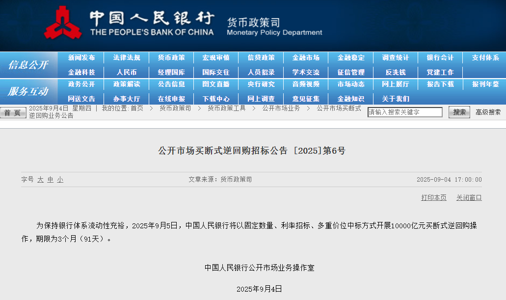 中国人民银行(以下简称“央行”)9月4日公告,为保持银行体系流动性充裕,将于9月5日以固定数量、利率招标、多重价位中标方式开展10000亿元买断式逆回购操作,期限为3个月(91天)。