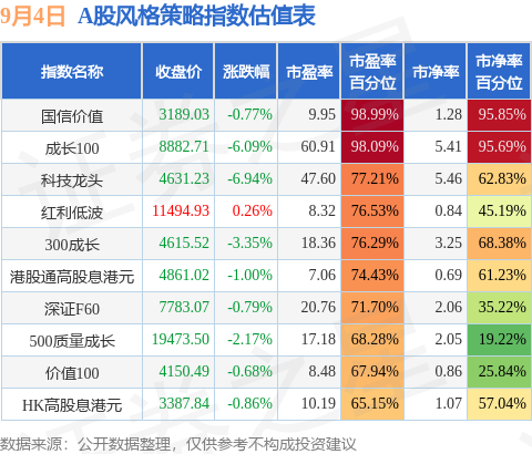 风格策略指数方面,国信价值的市盈率百分位较高,为98.99%。而HK高股息港元的市盈率百分位较低,为65.15%。
