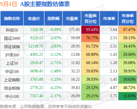 证券之星消息,9月4日A股收盘,上证综指指跌1.25%,报收3765.88点;深圳成指跌2.83%,报收12118.7点;创业板指跌4.25%,报收2776.25点。