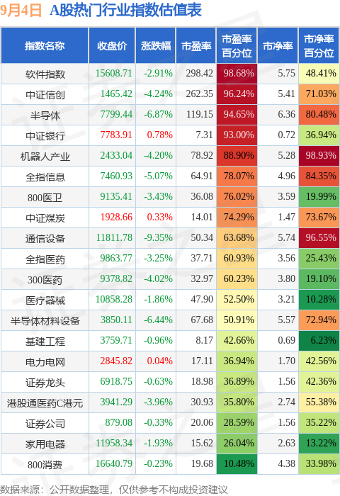 热门行业指数方面,软件指数的市盈率百分位较高,为98.68%。而800消费的市盈率百分位较低,为10.48%。
