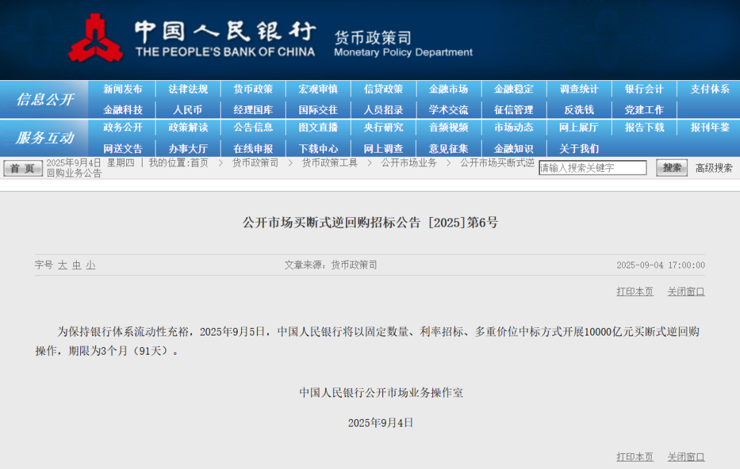 9月4日,中国人民银行发布公告称,为保持银行体系流动性充裕,中国人民银行将于9月5日以固定数量、利率招标、多重价位中标方式开展10000亿元买断式逆回购操作,期限为3个月(91天)。