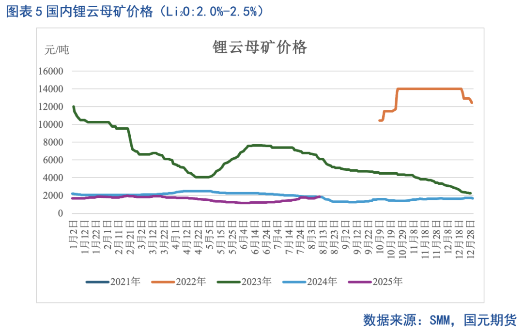 7月国内云母矿山在锂价上涨提振下,产量高位持稳;锂辉石矿山仍处于爬产周期,产量微增。从矿石价格来看,8月由于锂云母矿山存在停产,锂云母精矿价格较月初上涨20.18%。