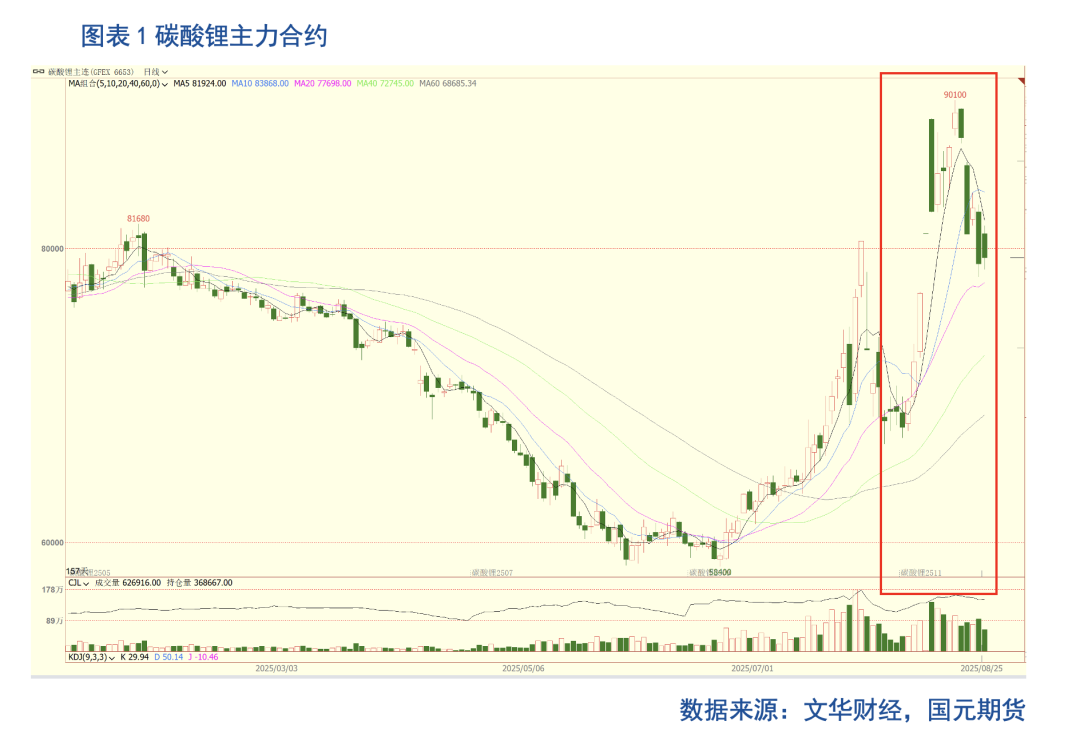 8月碳酸锂主力合约运行区间上移。8月初随着江西头部企业矿山采矿证到期落地,市场对矿山停产进行交易,锂价大幅上行;该矿山停产以及前期青海盐湖部分产线停产,均代表着国内锂资源端审查趋紧,市场预期青海盐湖及江西锂云母矿山停产范围进一步扩大,带动上半月锂价整体偏强运行;但由于已停产矿山及盐湖影响有限,碳酸锂基本面维持宽松,而资源端停产范围扩大缺少消息面进一步支撑,下半月锂价回落;但由于前期高价限制下游采购需求,随着锂价下行,下游补库支撑锂价运行区间较月初上移。