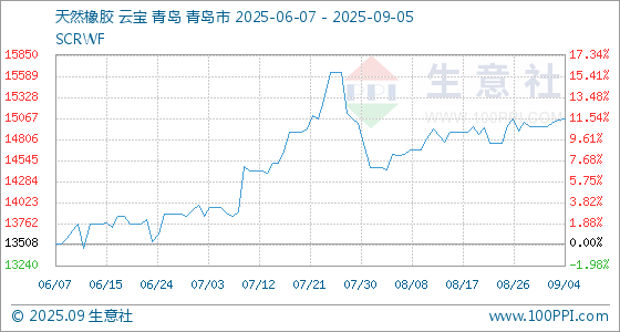 9月5日,生意社天然橡胶基准价为15058.33元/吨,与本月初(14966.67元/吨)相比,上涨了0.61%。