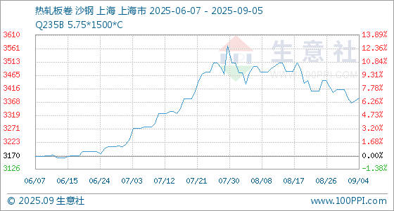 9月5日,生意社热轧板卷基准价为3383.33元/吨,与本月初(3413.33元/吨)相比,下降了0.88%。