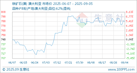 9月5日,生意社铁矿石(澳)基准价为788.89元/吨,与本月初(794.00元/吨)相比,下降了0.64%。