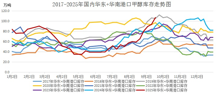 面对甲醇下游偏弱的需求现状,在外部进口量回升背景下,沿海港口甲醇库存继续维持累库态势。据统计,截止2025年8月29日当周,我国华东和华南地区的港口甲醇库存量攀升至106.6万吨,处在年内高位水平,不仅周环比大幅增加13.18万吨,而且月环比大幅增加47.89万吨,较去年同期大幅增加16.52万吨。其中,华东地区港口周环比增长7.22万吨,华南地区港口周环比增长5.96万吨。根据往年累库周期来看,未来一个月内,国内港口甲醇库存仍将维持高位运行态势,一般等到10月中旬以后,才会转入明显的库存去化阶段。