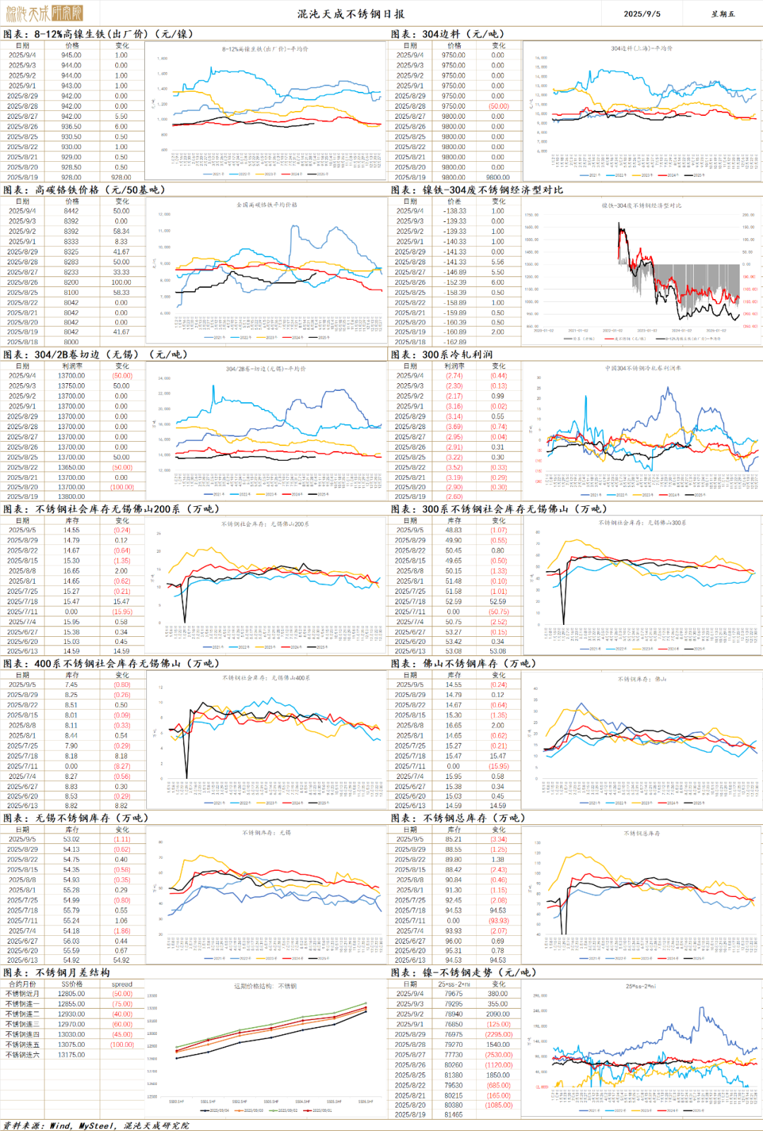 综合来看,目前供应端近期不锈钢厂检修逐步完成,供应压力或缓慢回升,需求端国内相对稳定,海外面临贸易风险,整体供需格局维持过剩。加之目前供应风险解除,宏观情绪有所回落,因此不锈钢价格持续回落。但目前国内宏观政策相对积极,且面临金九银十需求,海外降息预期回升,预计不锈钢价格下方空间有限。后续观察宏观环境变化、供需两端政策力度与落地情况以及供应端变化、海外贸易环境变化。