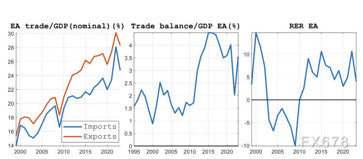 在此期间,该地区贸易开放度不断提升,但实际汇率(RER)亦无明显趋势。部分观点认为,欧元区贸易顺差为正,反而反映出了其国内需求不足,尤其是投资疲软。