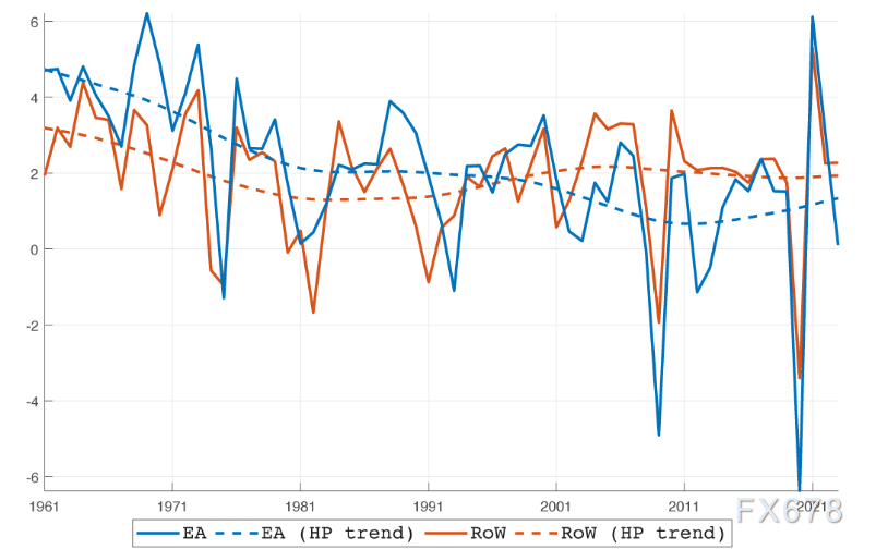为解答这些问题,整个研究利用1999年至2023年欧元区与其他地区的数据,该分析框架的核心创新点在于对趋势性冲击的明确建模。