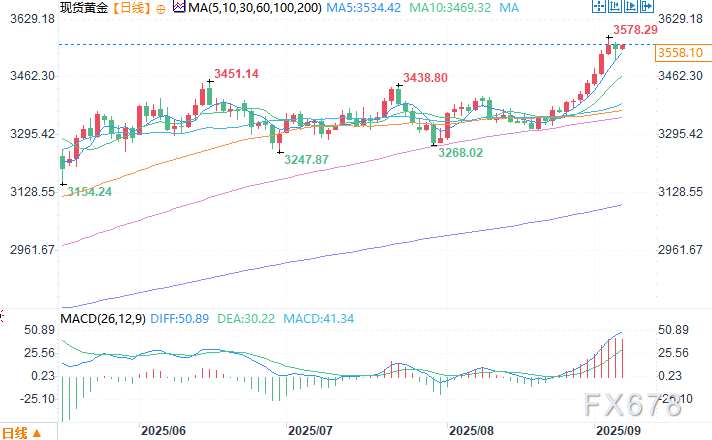 北京时间9月5日13:09 现货黄金报 3557.69美元/盎司