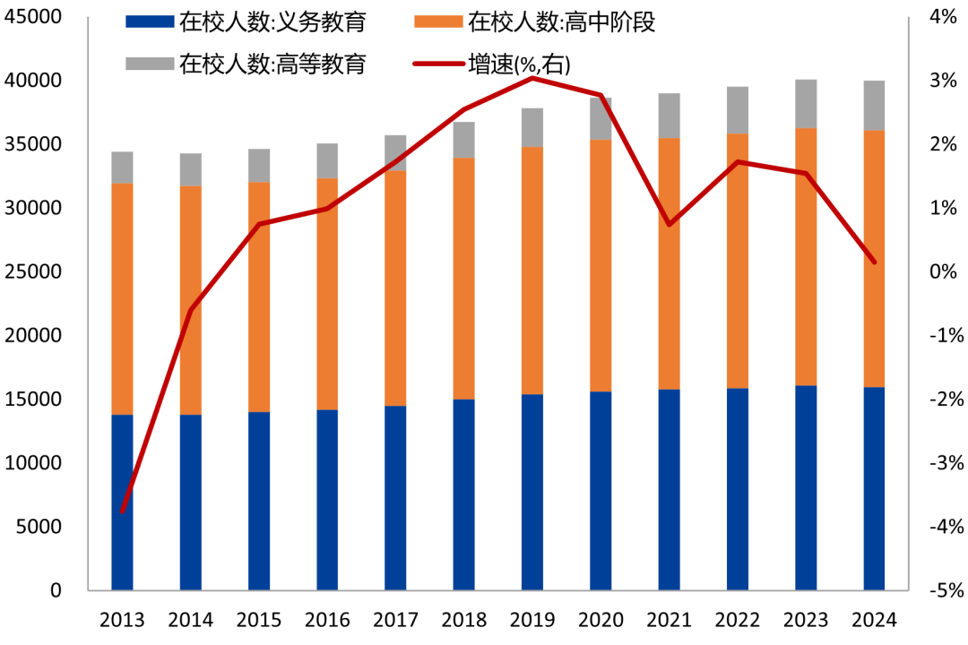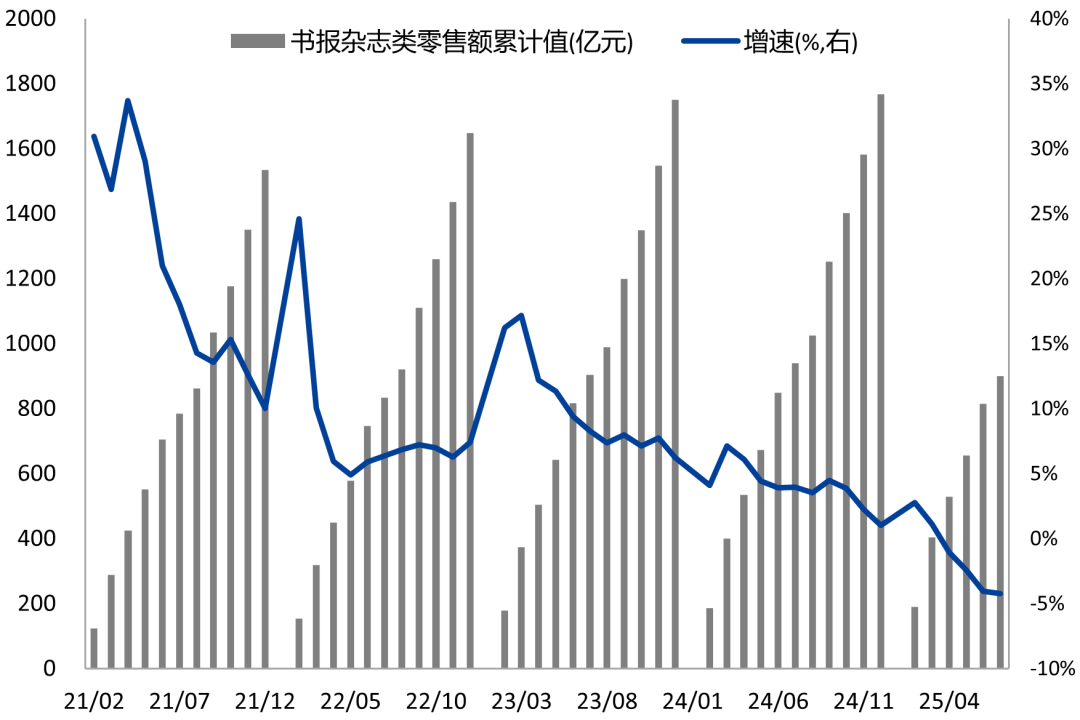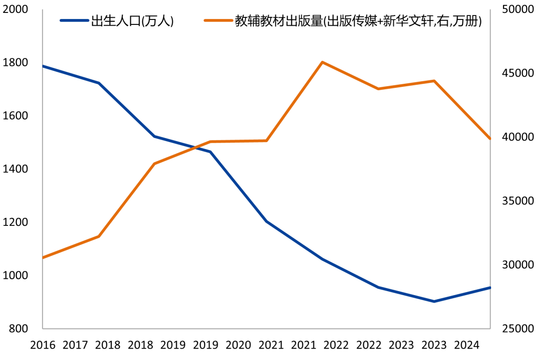 下游消费中,教辅材料占比大约在40%左右,因此消费量呈现出较明显的季节性特征,通常3-5月和9-11月由于教材招标的因素,为传统消费旺季。教辅材料需求呈现一定的刚性特征,但从趋势上来看,其受人口因素的影响较为直接。出生人口曾在2016-2017年受二胎政策的影响出现反弹,但力度较弱,目前下行趋势较为明确。而在校人数虽然尚未出现趋势性下滑,但已出现见顶迹象,2024年增速仅0.15%。而从头部出版企业教辅教材产量来看,也已出现下滑。因此从中长期来看,教辅教材需求走弱压力较大。其他社会需求则具有较大的弹性,但近年来的电子书、短视频等无纸化信息接收渠道对传统纸质书籍需求存在挤占,书报杂志类销售已进入负增长阶段。