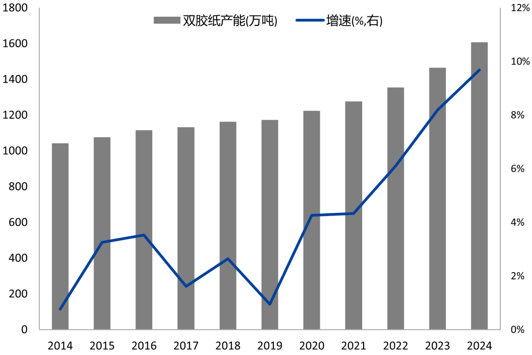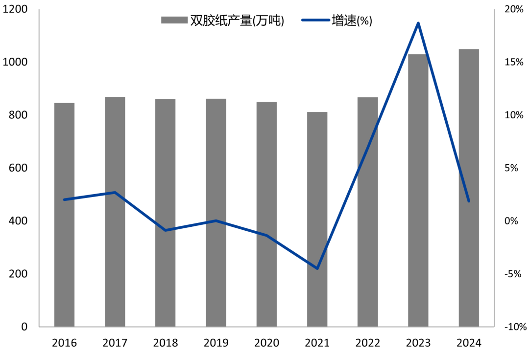 2024年我国纸及纸板产量13625万吨,同比增长5.09%,双胶纸产量1049.22万吨,同比增长1.87%。双胶纸产能自2020年起增速出现明显抬升,五年复合增长率达到6.5%,且当前仍处于产能扩张期。根据市场机构统计,2025年预计有超过200万吨的新增产能有待投放。
