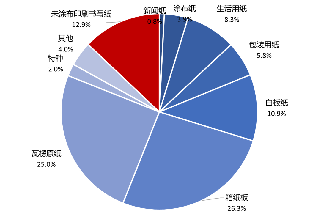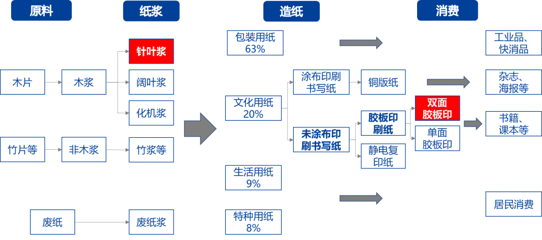 我国是全球胶版印刷纸最大生产国与消费国。胶版印刷纸是文化印刷用纸的典型代表纸种,文化用纸在我国纸张产量占比约20%,包装用纸(包括箱板纸、瓦楞原纸、白卡纸等)、生活用纸、特种用纸占比分别为63%、9%和8%。文化用纸主要可以分为未涂布印刷书写纸、涂布印刷纸和新闻纸等,其中未涂布印刷书写纸包括胶版印刷纸、书写纸、静电复印纸等。目前市场上多数胶版印刷纸为双面胶版印刷纸(简称双胶纸),在行业中通常用双胶纸代指胶版印刷纸。根据中国造纸协会等有关机构数据显示,双胶纸约占未涂布印刷书写纸国内消费量的半数以上,约占国内文化用纸消费量的40%。双胶纸的原料主要是漂白木浆,已上市的纸浆期货是双胶纸的原料之一。下游主要应用于图书、教材、杂志、笔记本、彩色图片等领域。