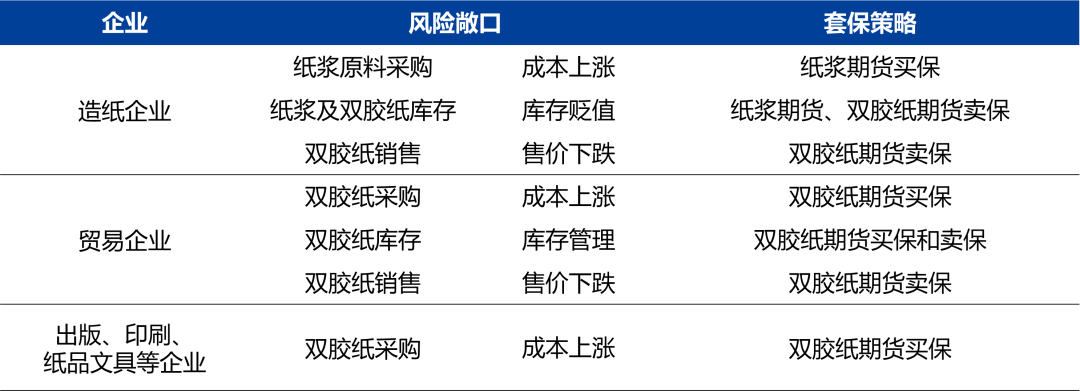 胶版印刷纸期货的上市将提升将市场透明度,有助于文化用纸产业链上、中、下游企业更有效的进行价格风险管理。对于上游造纸企业,可以利用已上市的纸浆期货和胶版印刷纸期货管理原料采购风险、优化库存、锁定生产利润;中游贸易企业则可以对双胶纸的采购端、销售端以及库存进行精细化管理;下游主要是出版、印刷企业,可以对双胶纸采购成本进行提前锁定。