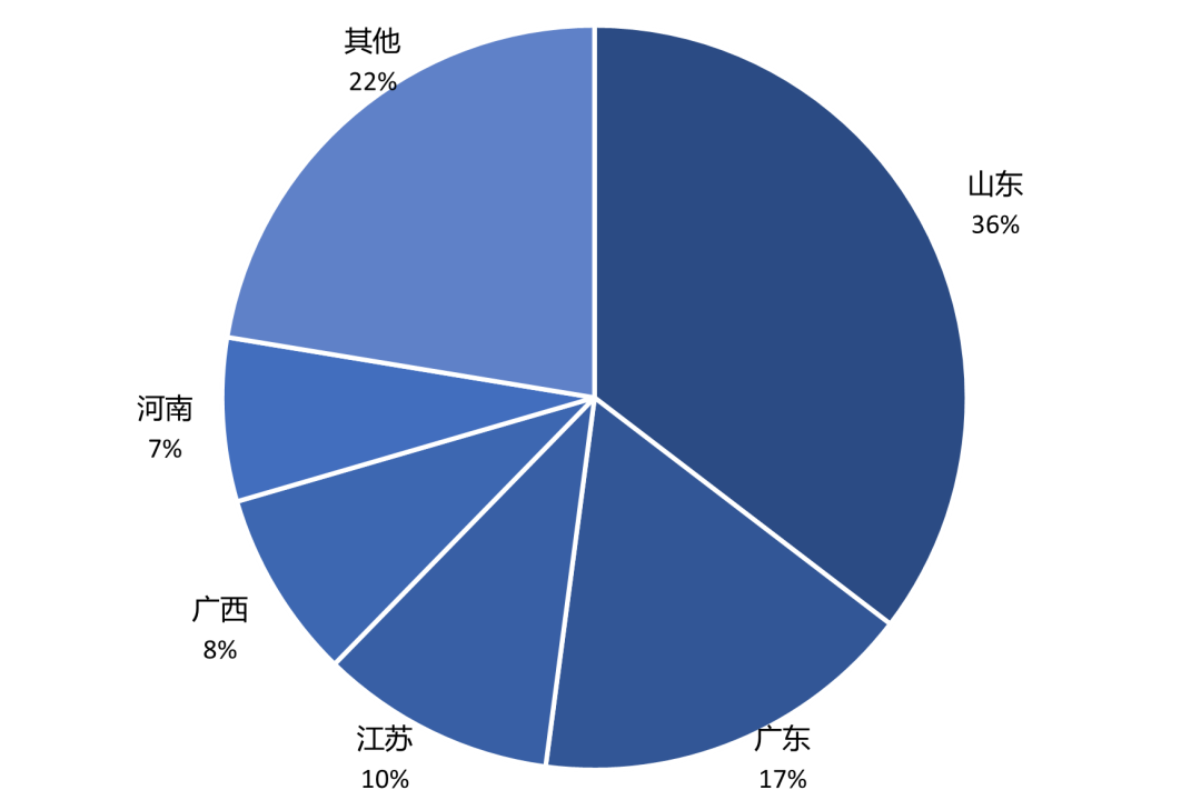 产能分布方面,生产企业主要集中在华东地区,占比超50%,其次是华南和华中地区。山东、广东和江苏等地由于靠近下游消费,是生产企业主要所在省份,分别占比35%、17%和10%。而近年来由于华南地区原料成本、物流运输等方面的优势,是产能扩张的主要区域。
