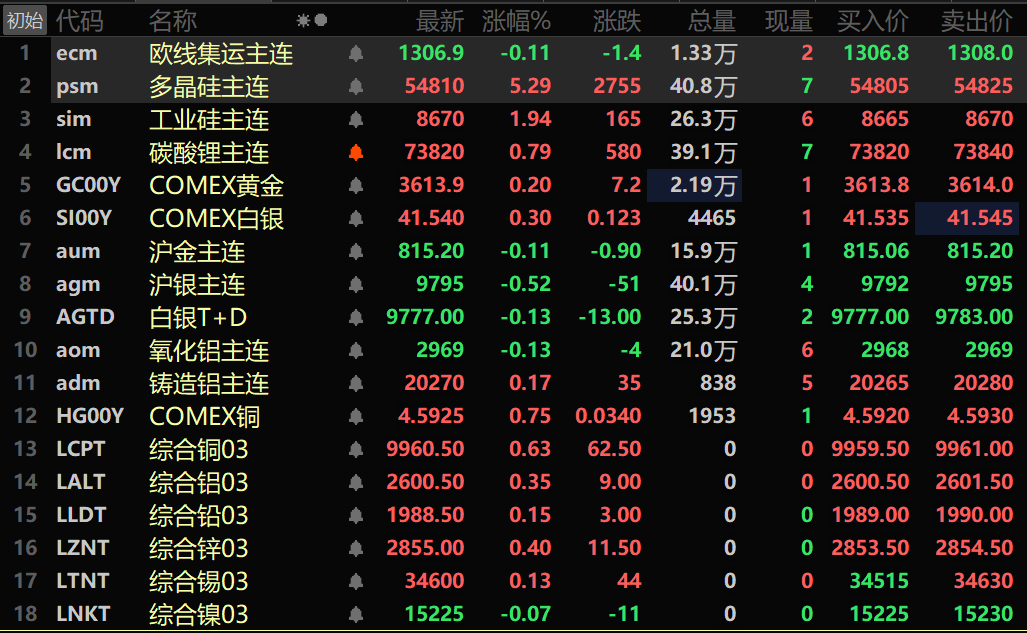 此外,铸造铝主连期货涨0.17%,氧化铝主连跌0.13%。碳酸锂主连涨0.79%,工业硅主连涨1.94%。多晶硅主连涨5.29%。