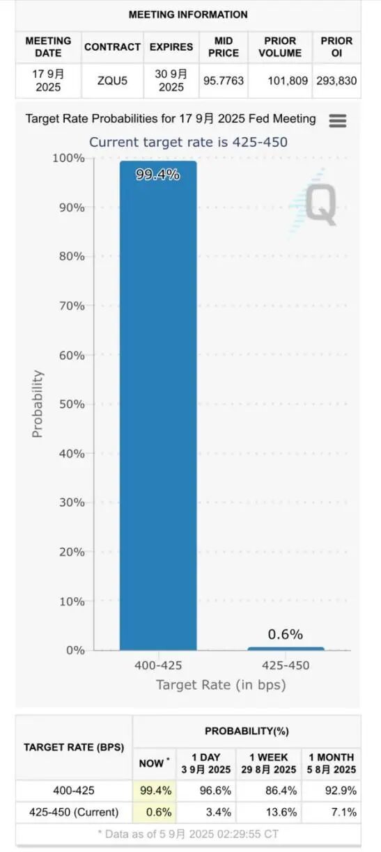 9月5日,CME美联储观察最新数据显示,美联储9月维持利率不变的概率仅余0.6%,而降息25个基点的概率高达99.4%,逼近100%,市场对9月的降息预期已基本“拉满”。