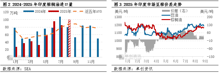 根据印度进口商预估,8月份印度食用油进口总量预计将达到160万吨,其中棕榈油进口量约为99.3万吨,较7月环比增长16%。然而当前印度市场豆棕价差处于偏低水平,加之8月份棕榈油进口量已接近100万吨,创下近13个月新高,尽管调税举措带来需求改善预期,但预计9月印度棕榈油进口量进一步增长的空间有限,后续实际采购进度仍需密切关注。