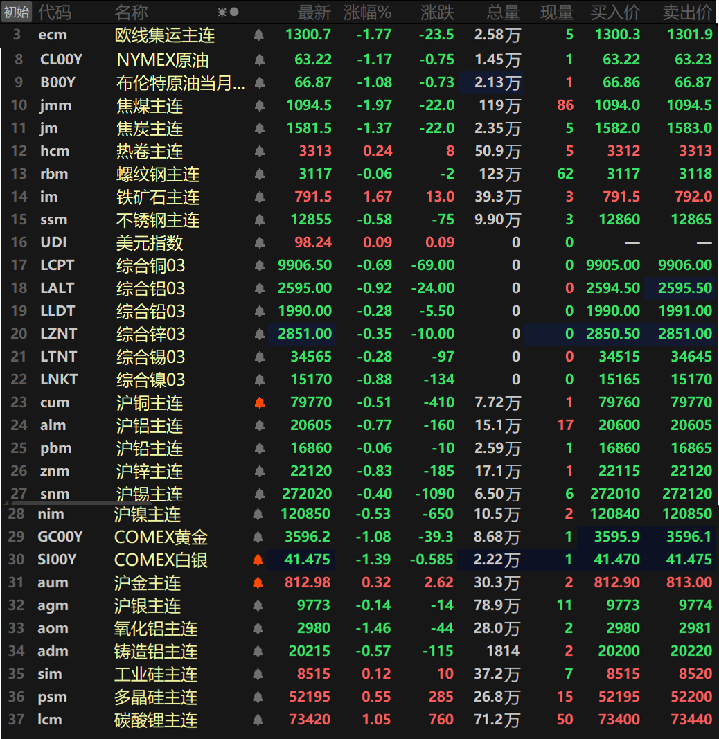 此外,碳酸锂主连涨1.05%,多晶硅主连涨0.55%,工业硅主连涨0.12%。欧线集运主连跌1.77%报1300.7。