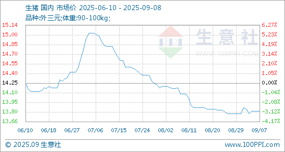 9月8日生意社生猪基准价为13.82元/公斤