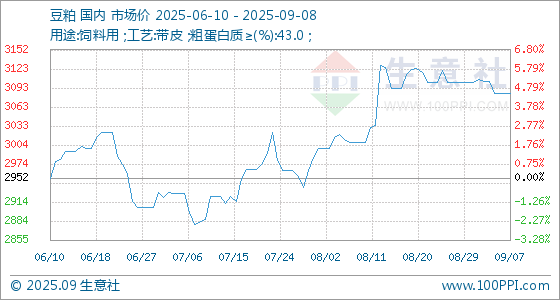 9月8日,生意社豆粕基准价为3084.00元/吨,与本月初(3102.00元/吨)相比,下降了0.58%。