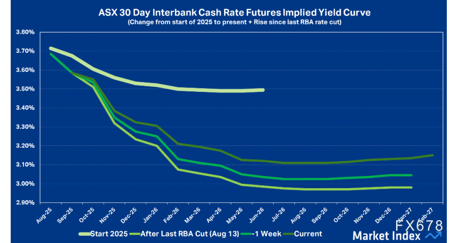 当前隐含收益率曲线较一周前明显上移,更显著高于三周前澳洲联储8月议息会议宣布降息后的水平。若以会后曲线低谷——2026年7月2.98%的利率预期(没错,是“2”字开头)为参照,可见市场已削减了13个基点的降息预期,这相当于常规降息幅度的一半以上。