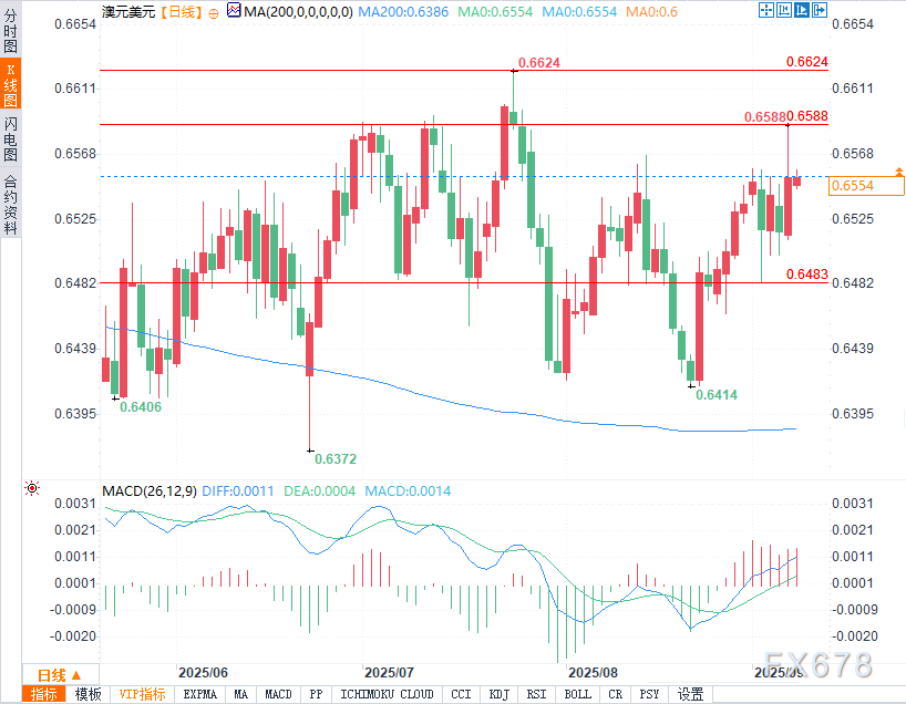 上行方面,前一交易日高点(0.6588)构成初步阻力,关键阻力位关注0.6624(8月高点)。
