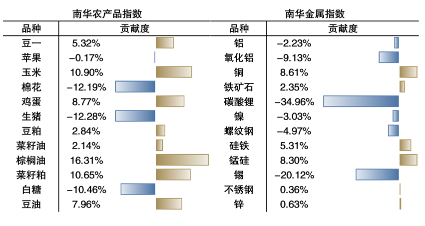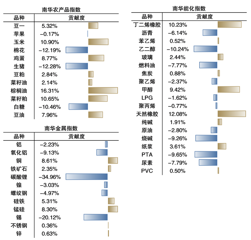 从大类板块指数的品种贡献度来看,南华综合指数中,正向贡献度最高的品种为白银,贡献度为17.44%;负向贡献度最高的品种为PTA,贡献度为-9.06%。南华工业品指数中,贡献度排行居于前两位的为天然橡胶、甲醇,贡献度分别为14.41%、11.24%,负向贡献度最突出的则是PTA、烧碱,分别是-11.50%和-11.04%。南华能化指数中,天然橡胶正向贡献度位居第一,而乙二醇负向贡献度最多,为-10.24%。南华农产品指数中,正向贡献度最高的是棕榈油,为16.31%,负向贡献度最高的为生猪和棉花,贡献度分别为-12.28%和-12.19%。南华金属指数中,负向贡献度最高的为碳酸锂,为-34.96%。