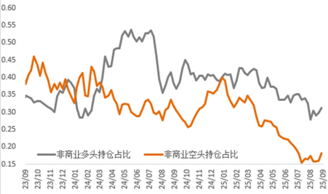 持仓方面,SPDR黄金ETF持仓环比增加4.3吨至981吨,SLV白银ETF持仓环比减少116吨至15194吨;上周COMEX黄金非商业总持仓为38.2万手,其中非商业多头持仓增加40029手至31.6万手,空头持仓增加4810手至6.6万手;非商业多头持仓占优,比例较上周上升至64.1%附近,非商业空头持仓占比下降至13.4%左右。