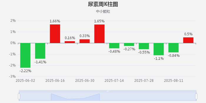 根据2024年6月2日-2025年8月18日周K柱图可以看出,国内尿素周期内涨跌互现。8月国内尿素下跌较多,最大跌幅在8月4日当周跌幅为-1.1%。