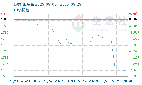 据生意社商品行情分析系统,截止8月28日,国内尿素市场参考均价为1717元/吨,较8月1日参考均价1812元/吨,国内尿素市场价格下跌幅度为5.24%。